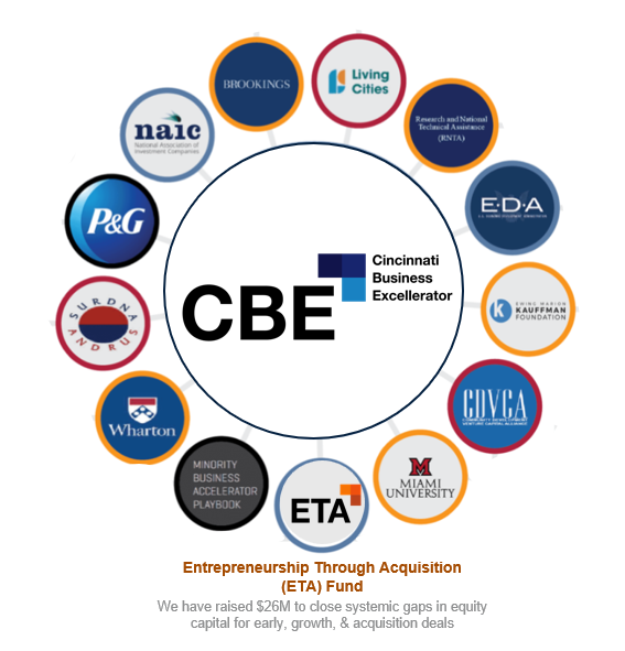 The Cincinnati Business Excellerator (CBE), formerly the Minority Business Accelerator, has supported BIPOC founders for over 22 years through strategic partnerships, advisory services, and preparation for access to growth capital and new business opportunities. Backed by investment partners, we’ve raised $26M for our inaugural ETA Fund to deploy into acquisition-ready businesses in underserved Midwest markets. Alongside capital, we provide hands-on guidance to ensure founders are prepared to receive and manage equity investment.