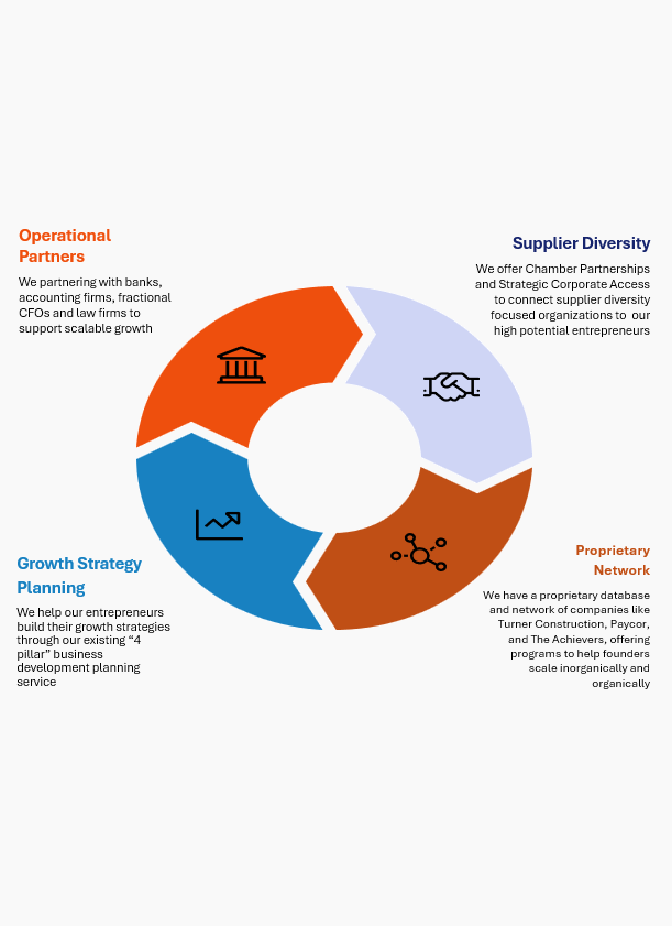 We collaborate with mission-aligned corporate partners, Funders, professional services, foundations, and institutions to expand access to revenue-generating opportunities, procurement pathways, and capital for high-potential professionals and entrepreneurs. Through these partnerships, we provide our Featured Firms with direct access to decision-makers, supplier networks, and business development programs that fuel both organic and inorganic growth.